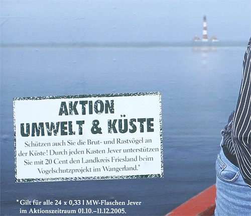 Mit einer großen Sammelaktion lebt das Friesische Brauhaus zu Jever das, was es sich auf die Fahnen geschrieben hat: Vertrauenswürdigkeit, Verlässlichkeit und das Denken über den Sudkessel hinaus, aber immer in enger Verbundenheit zur Heimatregion. Von jedem deutschlandweit verkauften Kasten 24 x 0,33-l Jever (Jever Pilsener, Jever Fun, Jever Light, Jever Dark oder Jever Lime)gehen in der Zeit vom 01. Oktober bis 11. Dezember 2005 jeweils 20 Cent an die Naturschutzbehörde des Landkreises Friesland in Zusammenarbeit mit dem Umweltverband BUND - Kreisgruppe Friesland. Das Geld wird zum Schutz der Brut- und Rastvögel im Wangerland eingesetzt, in einem Teil des Küstengebiets, das nach der EU-Vogelschutzrichtlinie geschützt ist.